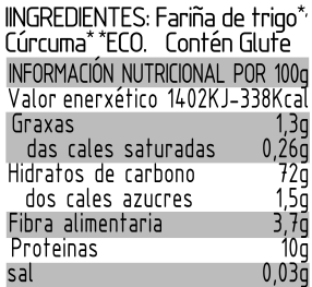 Elaborada con trigo duro e cúrcuma, de forma artesanal, con moldes de bronce e secado lento a baixa temperatura.