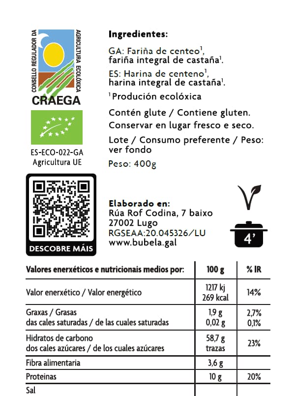 Elaborada con Centeno y Castaña gallega secada en secadero tradicional, de forma artesanal, con moldes de bronce y secado lento a baja temperatura.